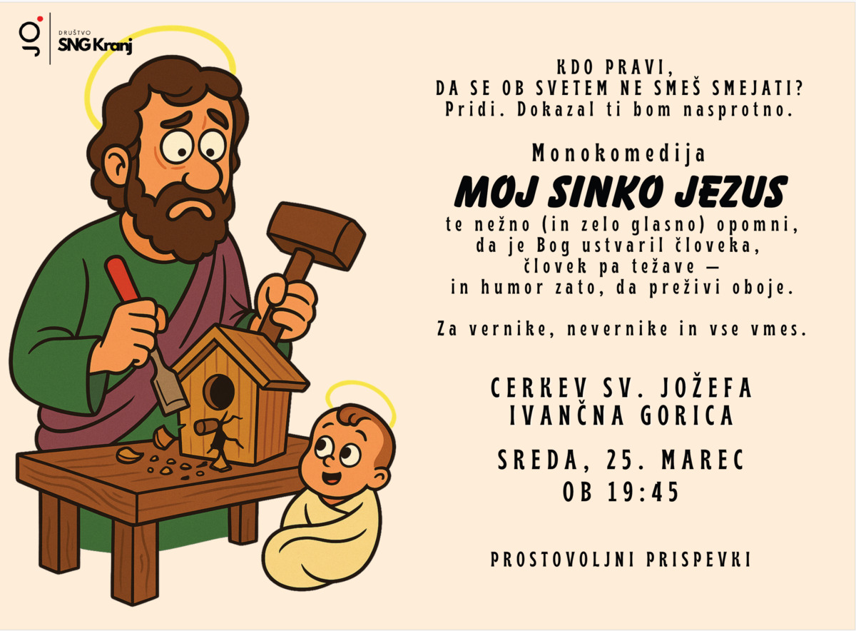 Ob zaključku tedna družine in na materinski dan vas v sredo, 25. marca 2026, vabimo v cerkev sv. Jožefa v Ivančni Gorici. Gostovali bomo vznemirljivo monodramo v izvedbi društva SNG Kranj, ki v osredje postavlja lik svetega Jožefa na način, kot ga še niste doživeli.
