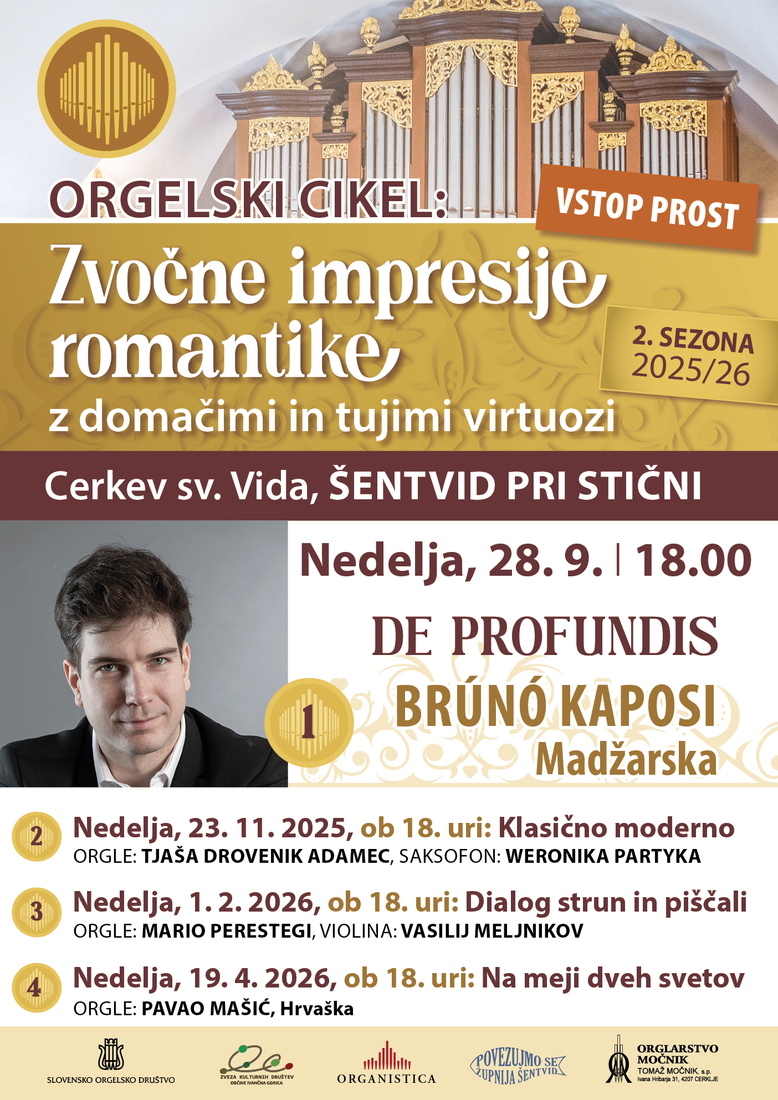 V šentviški cerkvi, ki že več kot tisočletje stoji kot pričevalka duhovne in kulturne dediščine, so leta 2023 postavili nove orgle – glasbilo, ki v svojem zvoku ponovno obuja duh slovenske romantike, obdobja, ki je odločilno zaznamovalo razvoj naše cerkvene glasbene kulture. V zadnjem letu so orgle zaživele kot koncertni instrument pod rokami treh izjemnih poustvarjalcev, njihovi večeri pa so pri poslušalcih našli topel in iskren odmev. Ob tem se je rodila zamisel o novem koncertnem ciklu, ki bo v štirih programsko raznolikih večerih predstavil bogastvo tega instrumenta v dialogu s sodobno ustvarjalnostjo.