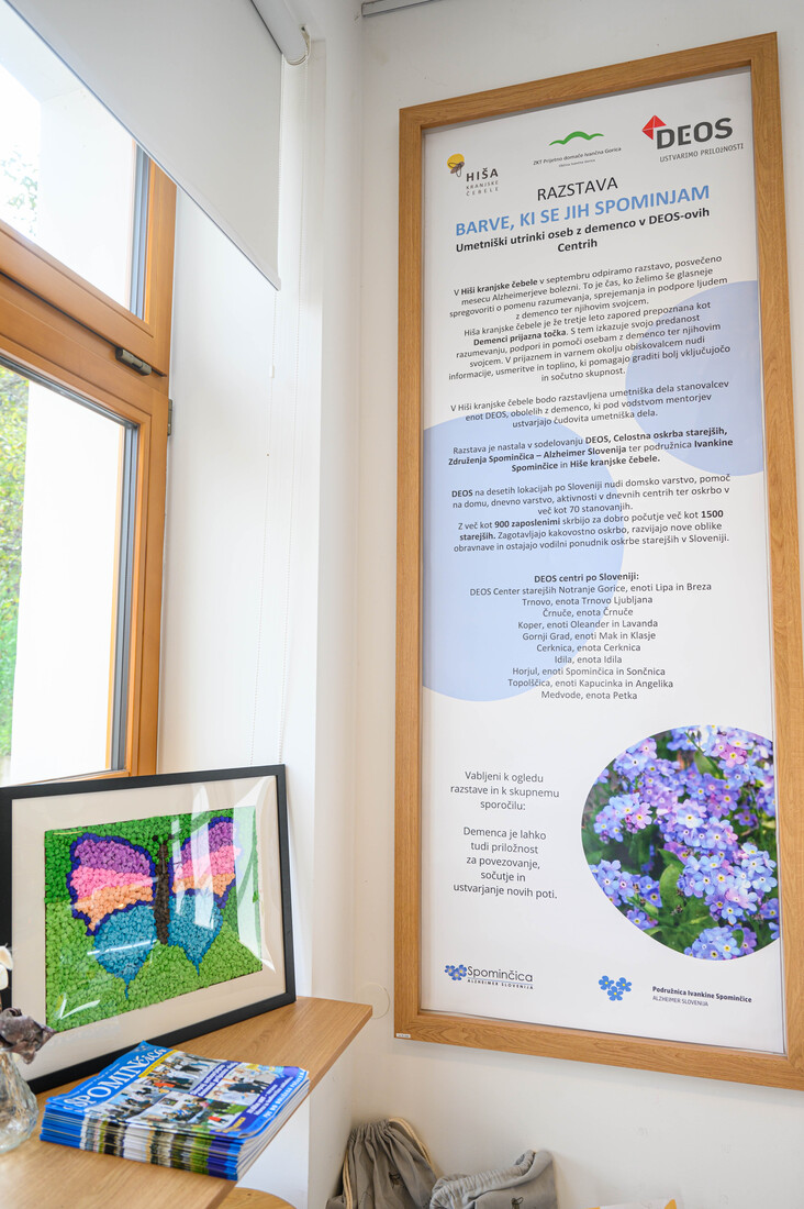 V Hiši kranjske čebele v Višnji Gori je v torek, 16. septembra 2025, potekalo odprtje 4. razstave likovnih del oseb z demenco, ki ustvarjajo pri likovni terapiji v domovih za starejše skupine DEOS, Celostna oskrba starejših. Razstava z naslovom: Barve, ki se jih spominjam, je posvečana mesecu Alzheimerjeve bolezni in pomenu oblikovanja vključujočega ter solidarnega okolja za osebe z demenco.