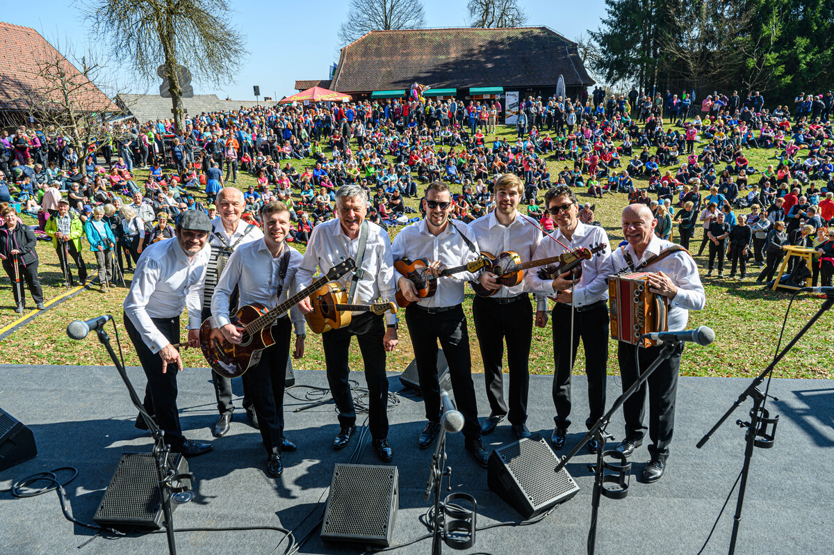 Na Jurčičevi domačiji na Muljavi je pohodnike pričakal pester kulturni program domačih društev, vrhunec dogajanja pa je bil nastop Prifarskih muzikantov.